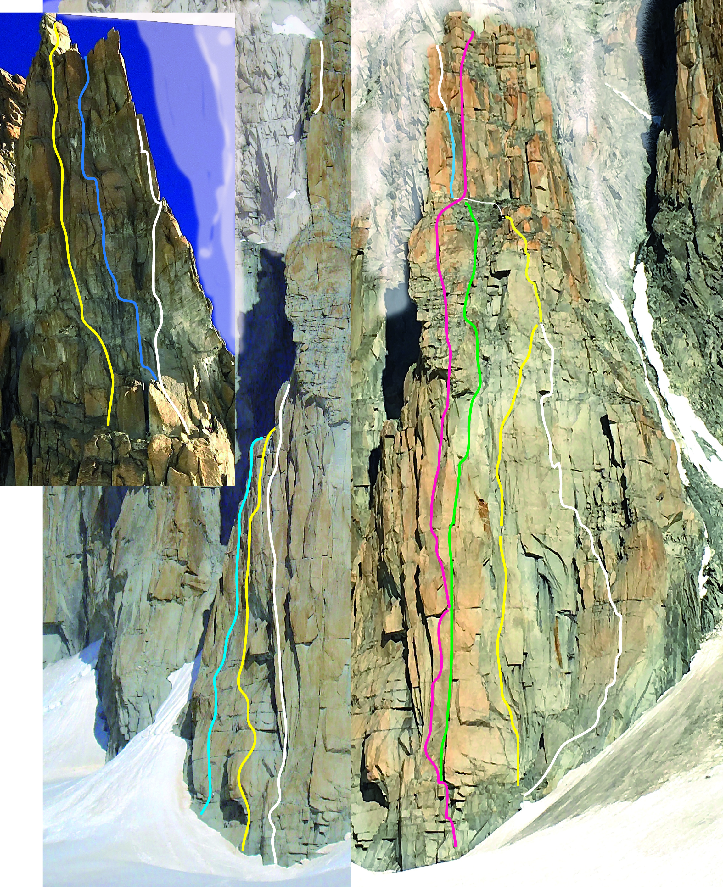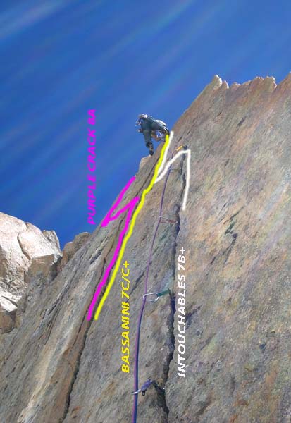 Astro Zap: from the Chandelle - Trident gully climb two pitches of Bonatti Zappelli route then climb an indipendent superb crack line to the top.