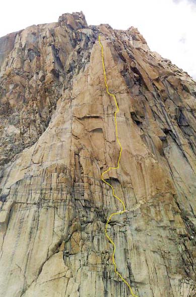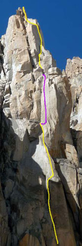 Gran Torino. Sale nello scudo a destra del pilastro del Clocher esaurendosi a metà della parete per poi raggiungere la cima su terreno più semplice.