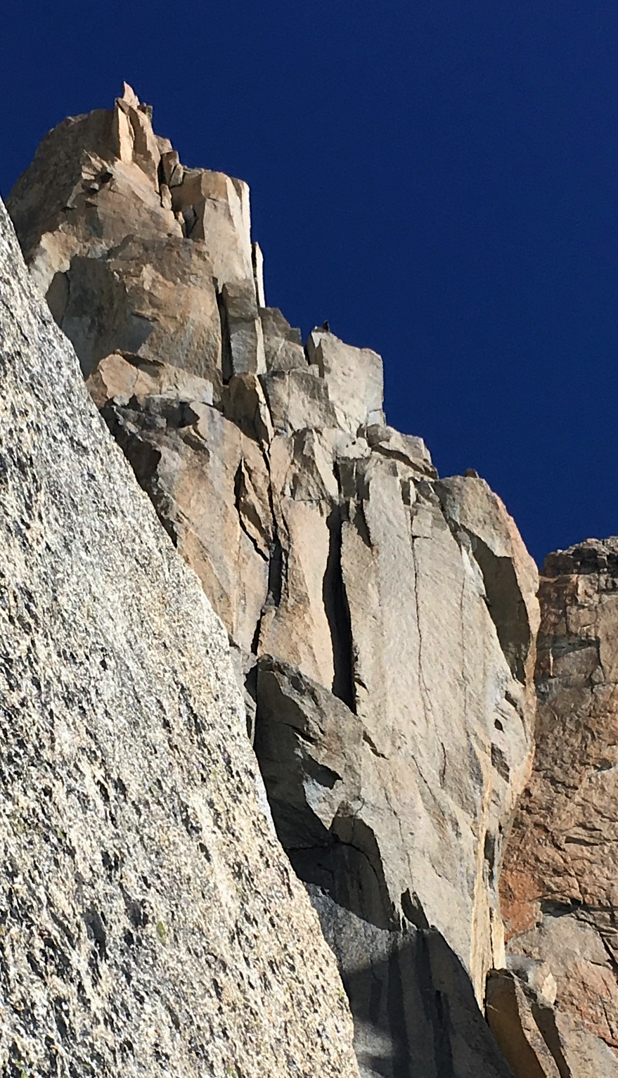 Di fronte alla Cresta della Brenva, verso nord, c’è il Mont Blanc du Tacul con tutti i suoi satelliti, una chiosa di silouettes di granito spettacolari. Esposte prevalentemente da est a sud-ovest brillano nel sole dall’alba al tramonto. La facilità dell’approccio ha fatto si che negli anni innumerevoli linee di scalata siano state tracciate. Noi li seguiamo da sinistra a destra, scendendo il Cirque Maudit. La prima parete è quella del Clocher du Tacul (m 3853), esposta a sud-ovest. Salendo il ghiacciaio la parete è defilata alla vista, ma poi si apre a sinistra del Pilastro Rosso del Clocher. La si raggiunge in un’ora e mezzo dal rifugio Torino.