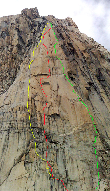 Tunnel Surprise. Alla base della parete parte da una fessura sottile che, ad oggi, è a sinistra della sosta a fix di Stelle e Tempeste con cui ha il secondo tiro in comune, però con uscita a sinistra verso la fessura del tetto a "Z", che supera. La successiva slot sale direttamente sopra la sosta con spettacolare esposizione. Le lunghezze successive perdono di intensità fino al buco e alla cima. Discesa in doppia su Stelle e Tempeste. Materiale: 8 rinvii, cordini, cams doppi da 0.4 a 2 pollici, 1 cam 3 pollici. Stelle e Tempeste. Sale la fessura diedro sulla destra della placconata di base (sosta a fix). Il secondo tiro esce a destra, il terzo sale dritto su placca e spigolo arrotondato per finire su esile fessura di dita (muschio!). Dalla sosta a sinistra poi fessure fino in cima. Bridwell Crack. Dalla sosta del terzo tiro delle precedenti si traversa a destra in orizzontale poi su scaglie fino alla sosta sotto la fessura di 40 metri.
