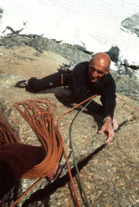 Kousmine. Sale al centro della parete del pilastro. Il passaggio della terminale non è sempre agevole ed esige cautela, poi una buona terrazza introduce alla parete. Scalata di fessura assai sostenuta e atletica specie nella parte superiore.Kousmine lies in the middle of the wall. The terminal crevasse is often wide and difficult, then a big ledge leads to the route. Strenuous jam crack climb in the upper part.