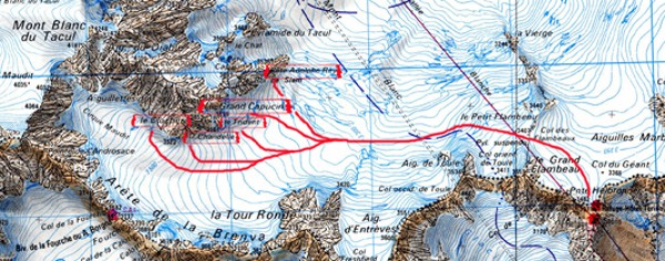 Petit Clocher du Tacul (3682 m). Parete sud. Si accede dal canale fra la Chandelle e il Trident che si raggiunge dal Rifugio Torino traversando alla Combe Maudit (1 ora). Si sale il canale sul lato destro orografico per un centinaio di metri con possibilità di protezioni su roccia.